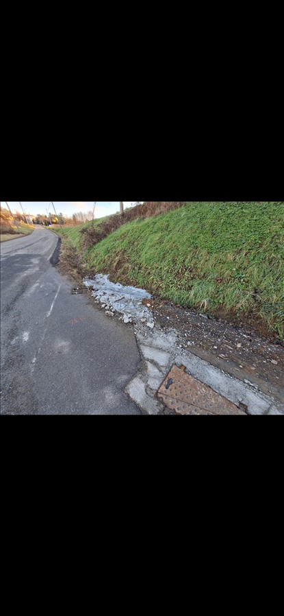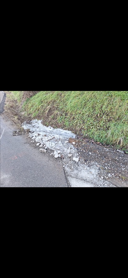 Mairano,intersezione via mombrione con via bernini manto stradale rattoppato con cemento che sbriciolandosi è un po' sulla strada e un po' nella griglia del tombino.