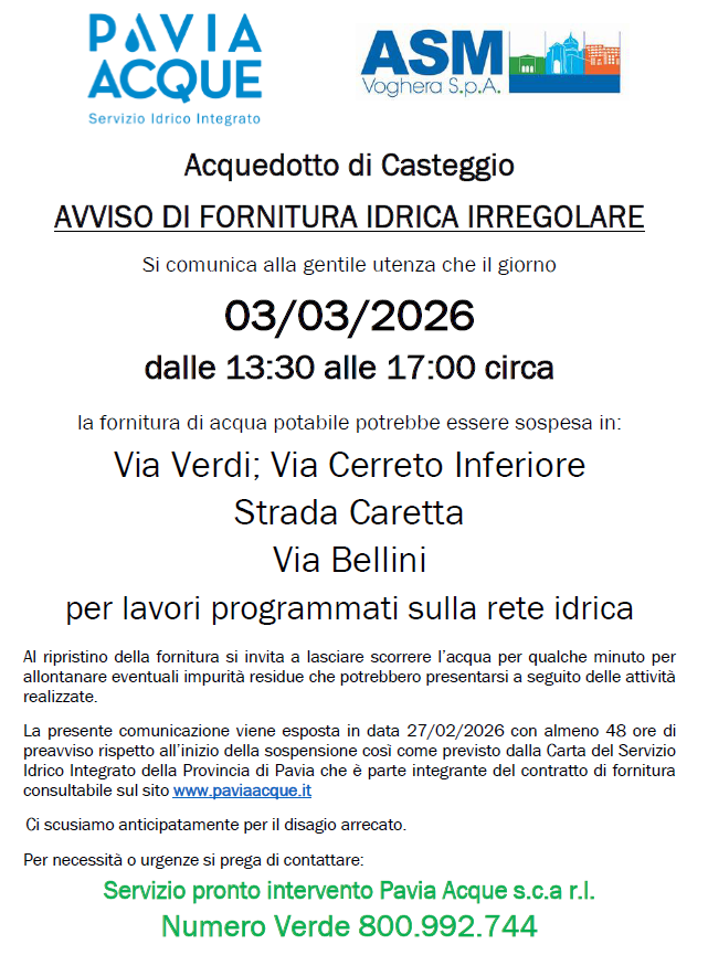 Con la presente si comunica che in data 03/03/2026 dalle ore 13:30 alle ore 17:00 nel comune di Casteggio, nelle vie riportate nell’avviso di interruzione del servizio - allegato, la fornitura di acqua potabile potrebbe essere sospesa per lavori programmati sulla rete idrica.